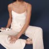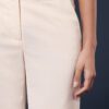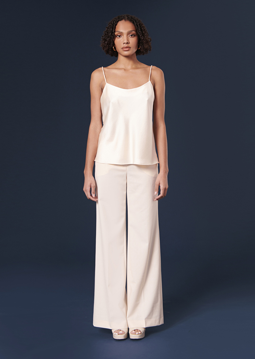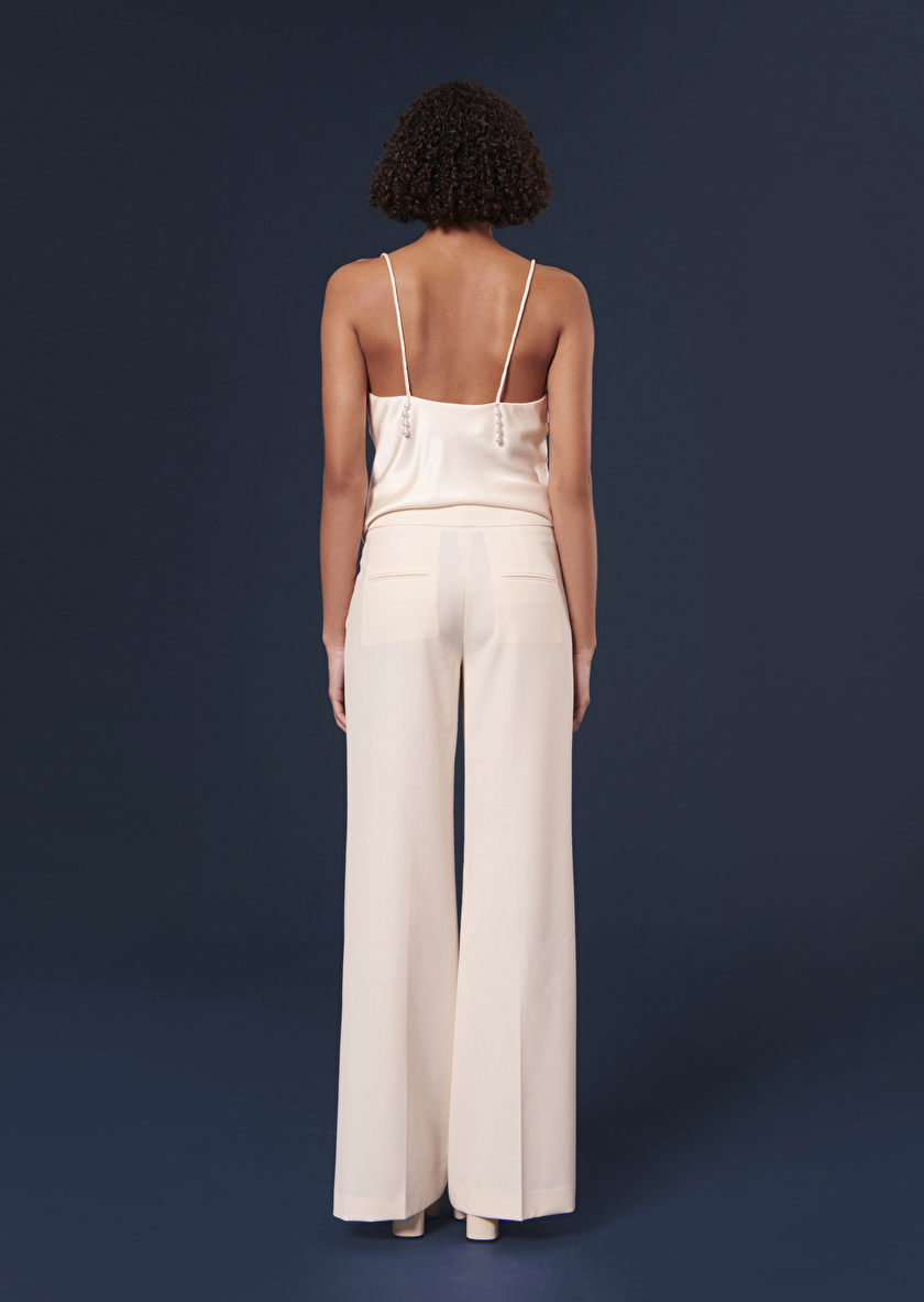 These ecru pants in cold wool have a wide, flared cut and a flat pleat. They have Italian pockets on the sides and welt pockets on the back. Classic zip, button and hook closure. Wear it with the matching Viola jacket for a chic, elegant total look. Also available in black.