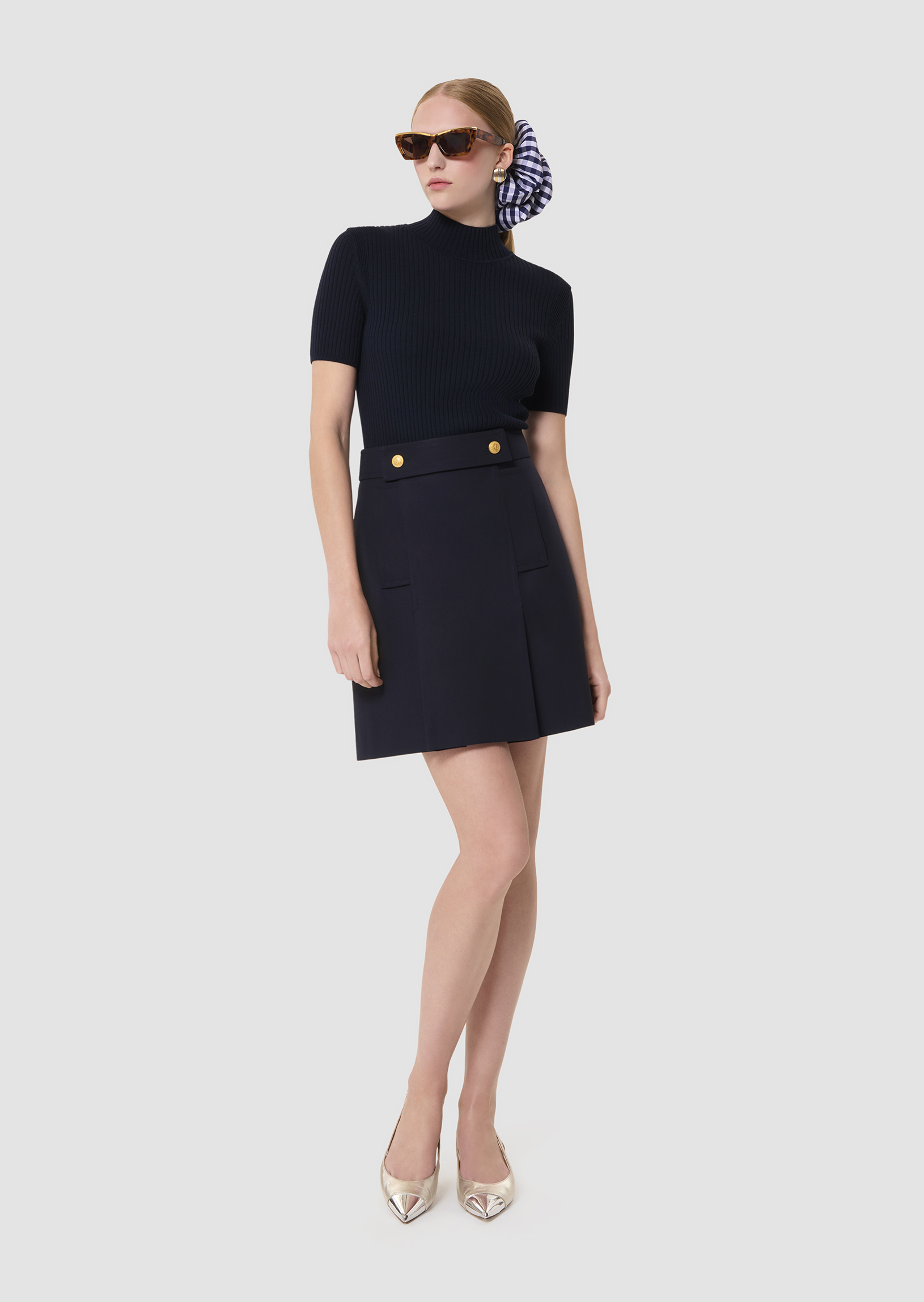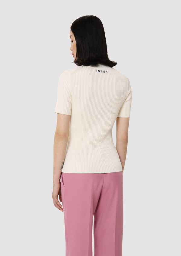This ecru rib-knit undershirt is almost second-skin. It has a small high collar and short sleeves. Its twist lies in the inscription “I love Tara” embroidered in jacquard at the nape of the neck.