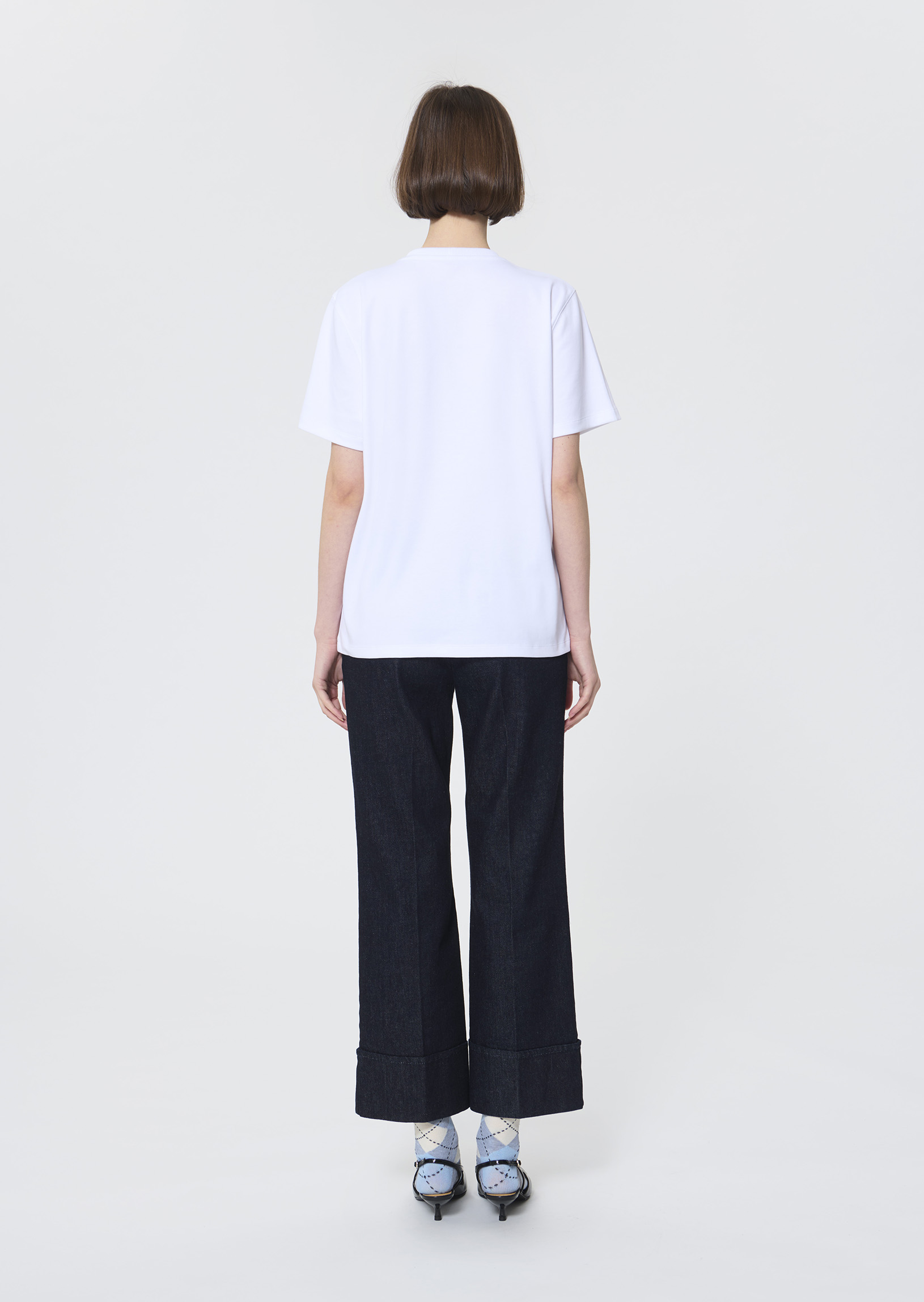 Taratwiggy, our white t-shirt. Made from carefully selected cotton. The t-shirt that stands out. This white cotton Taratwiggy t-shirt is part of the Betty or Twiggy wardrobe. It pairs perfectly with the Jasba skirt and the Martino coat.